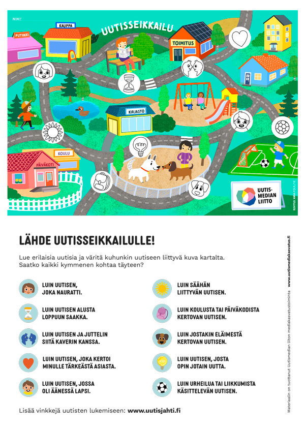 Lähtekää yhteiselle uutisseikkailulle! Uutisseikkailu koostuu kahdesta osasta. Jokaiselle oppilaalle on tarjolla oma kortti, jossa luetaan erilaisia uutisia ja väritetään niihin liittyvät kuvat kartalta. Koko luokan yhteisen Uutisseikkailu-julisteen avulla voitte tehdä yhteistä lukumatkaanne näkyväksi ja samalla pohtia, mitä ajatuksia ja tunteita lukemanne sisällöt teissä herättävät.